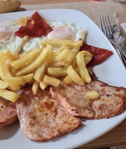 · Lomo o pechuga de pollo, pimientos y patatas fritas.